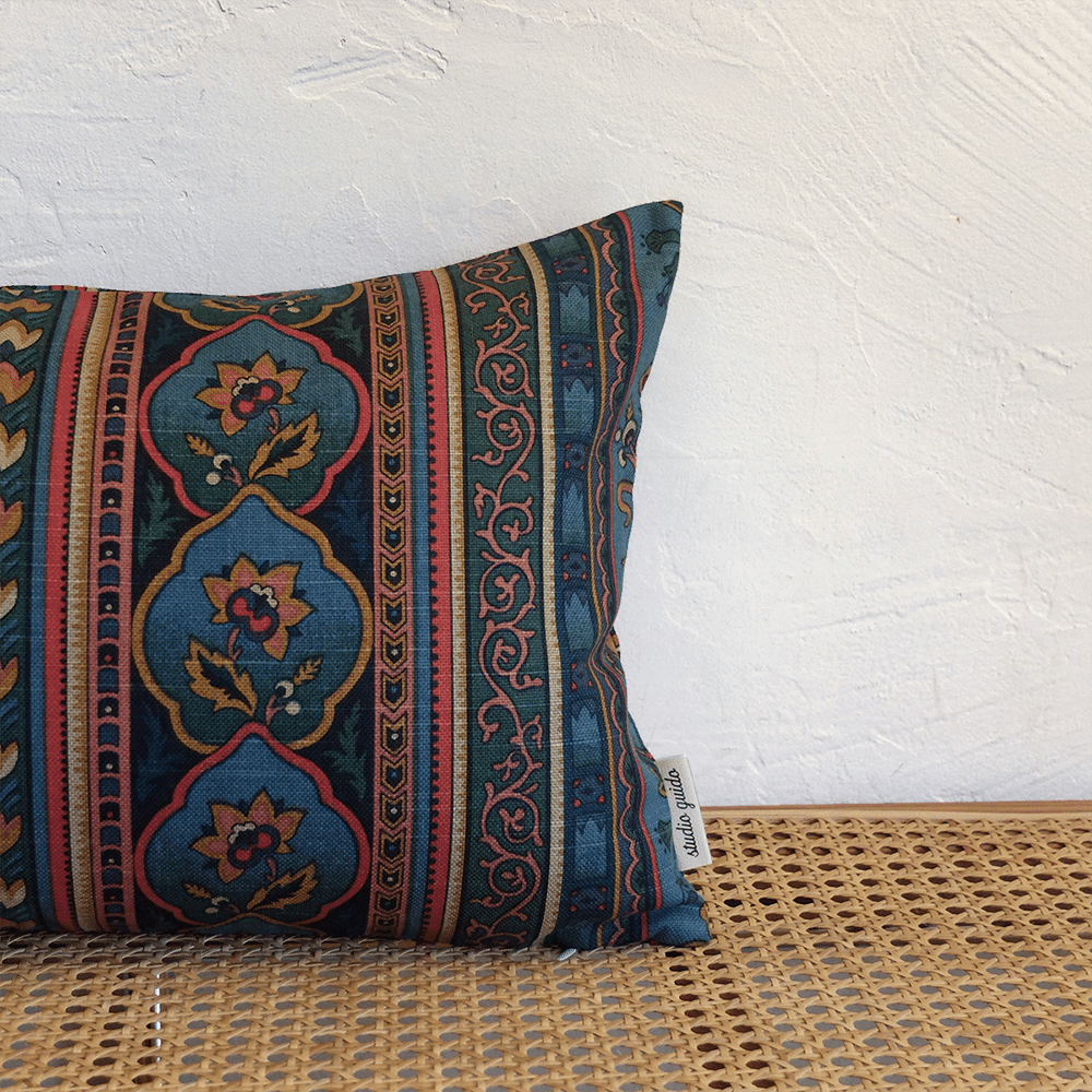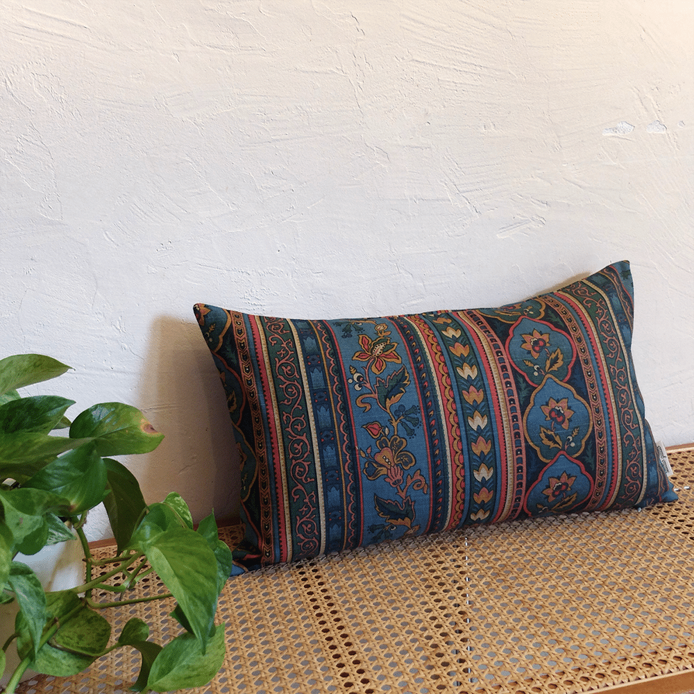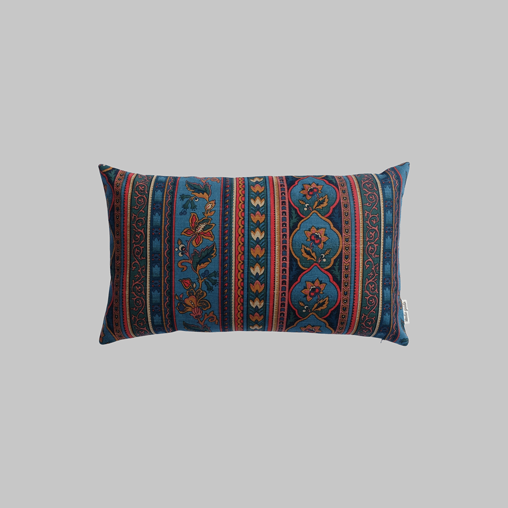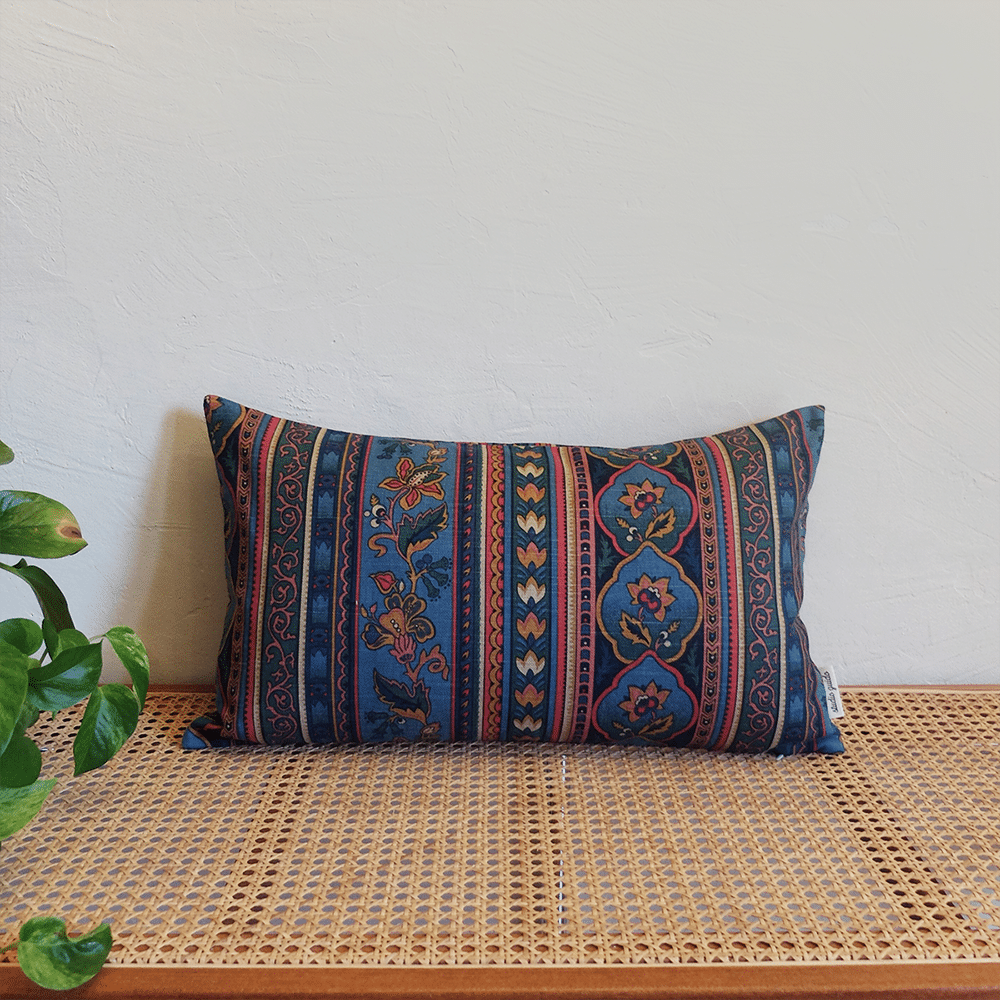 Housse de coussin 30x50cm, confectionnée à partir d’un ancien tissu à effet lin, imprimé de motifs floraux et ornementaux organisés en bandes verticales, très riche en couleurs. Fabriqué chez P/Kaufmann, ce tissu a été chiné soigneusement en Andalousie.
