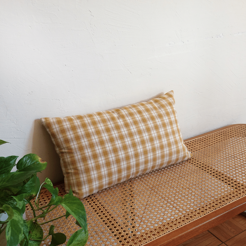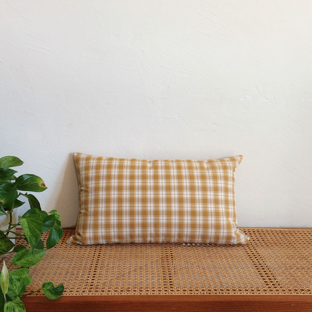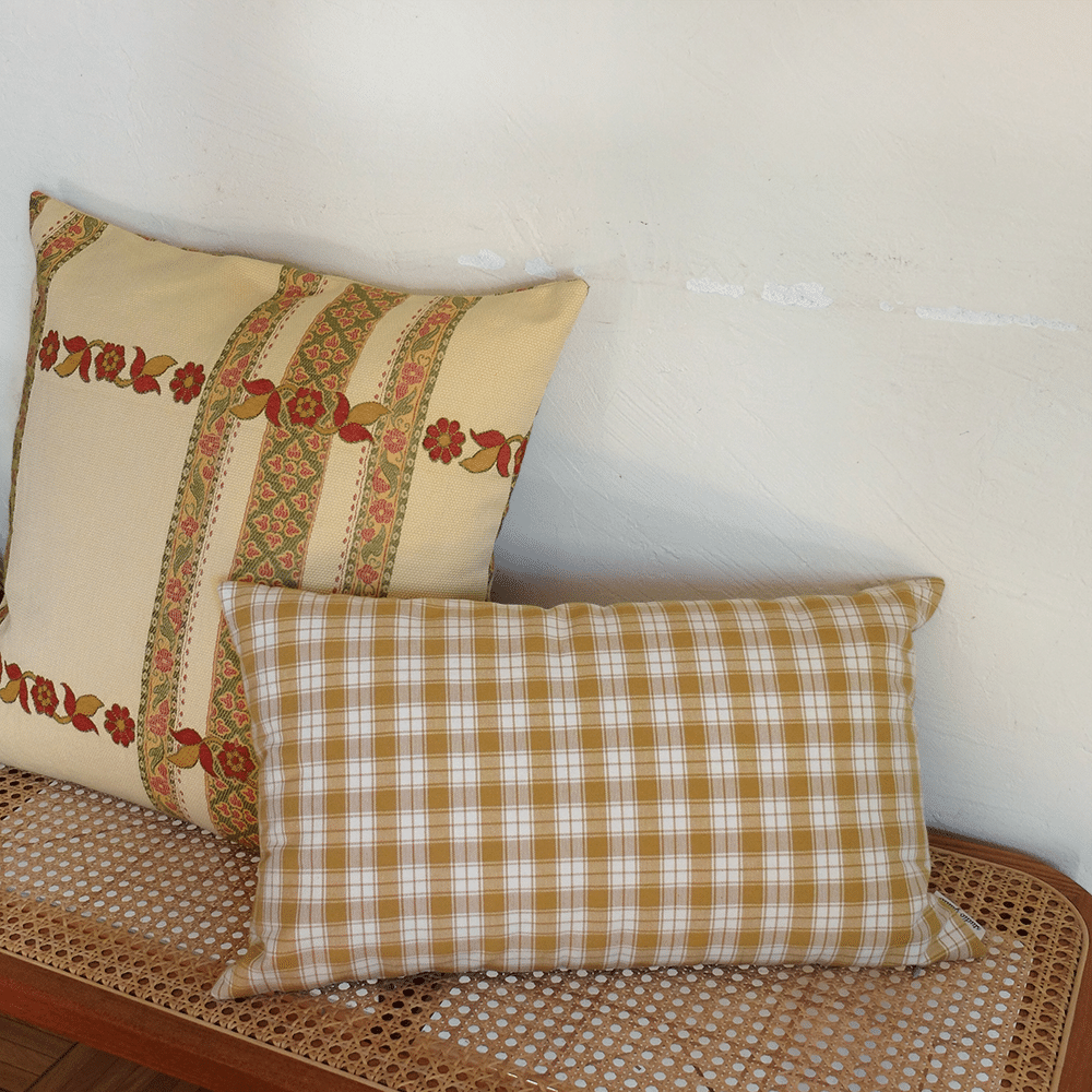 Funda de cojín de 30x50cm, confeccionada a partir de una antigua tela de tapicería de cuadros Vichy color amarillo ámbar.