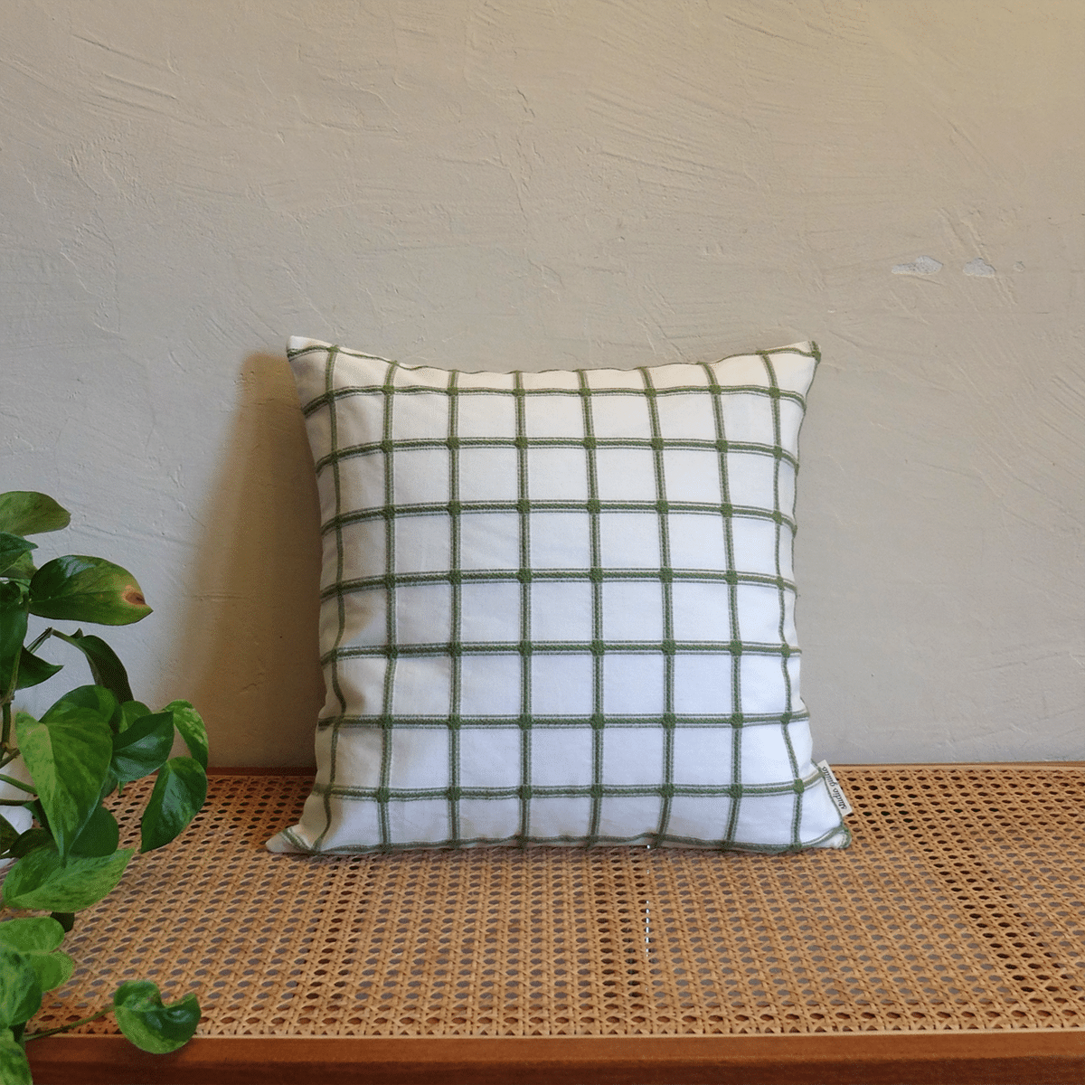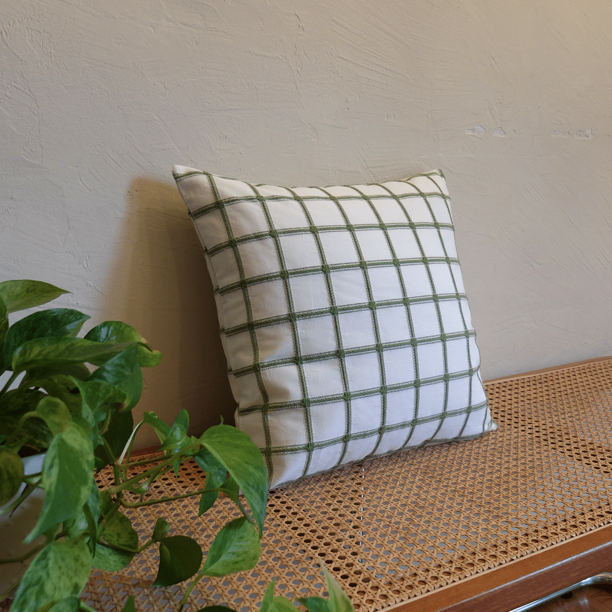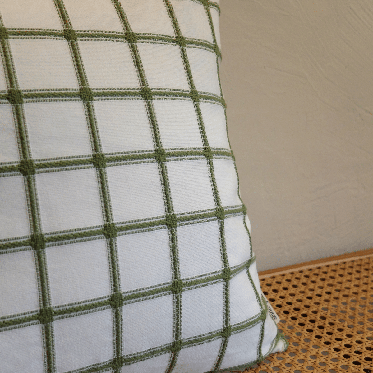 Funda de cojín de 40x40cm, confeccionada en un tejido blanco con cuadros verdes bordados que crean un elegante relieve.