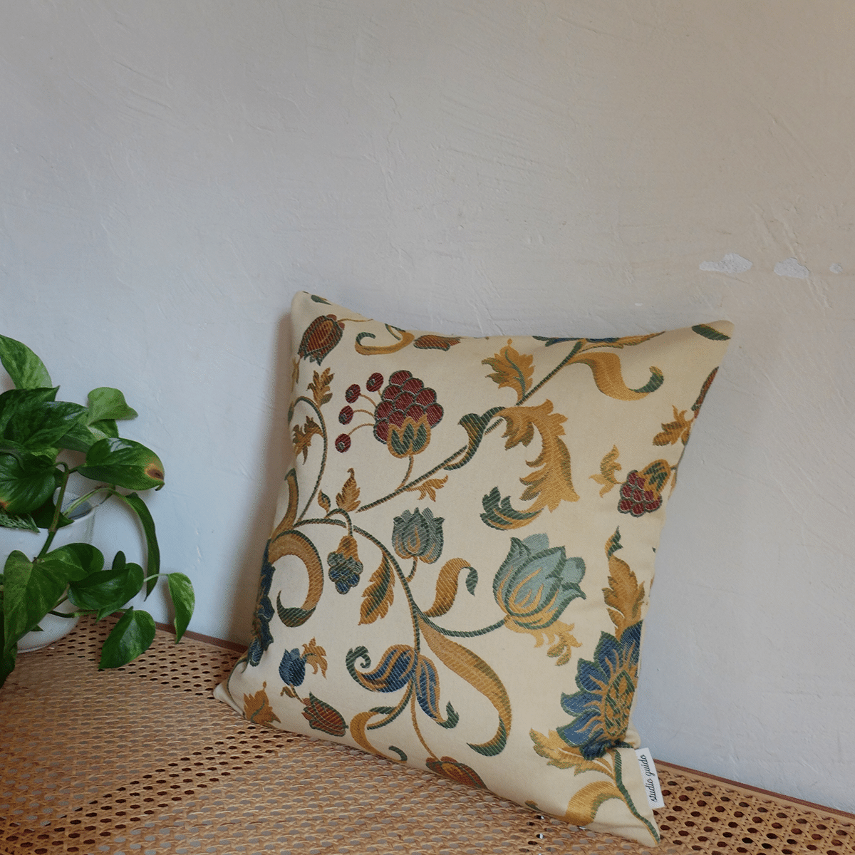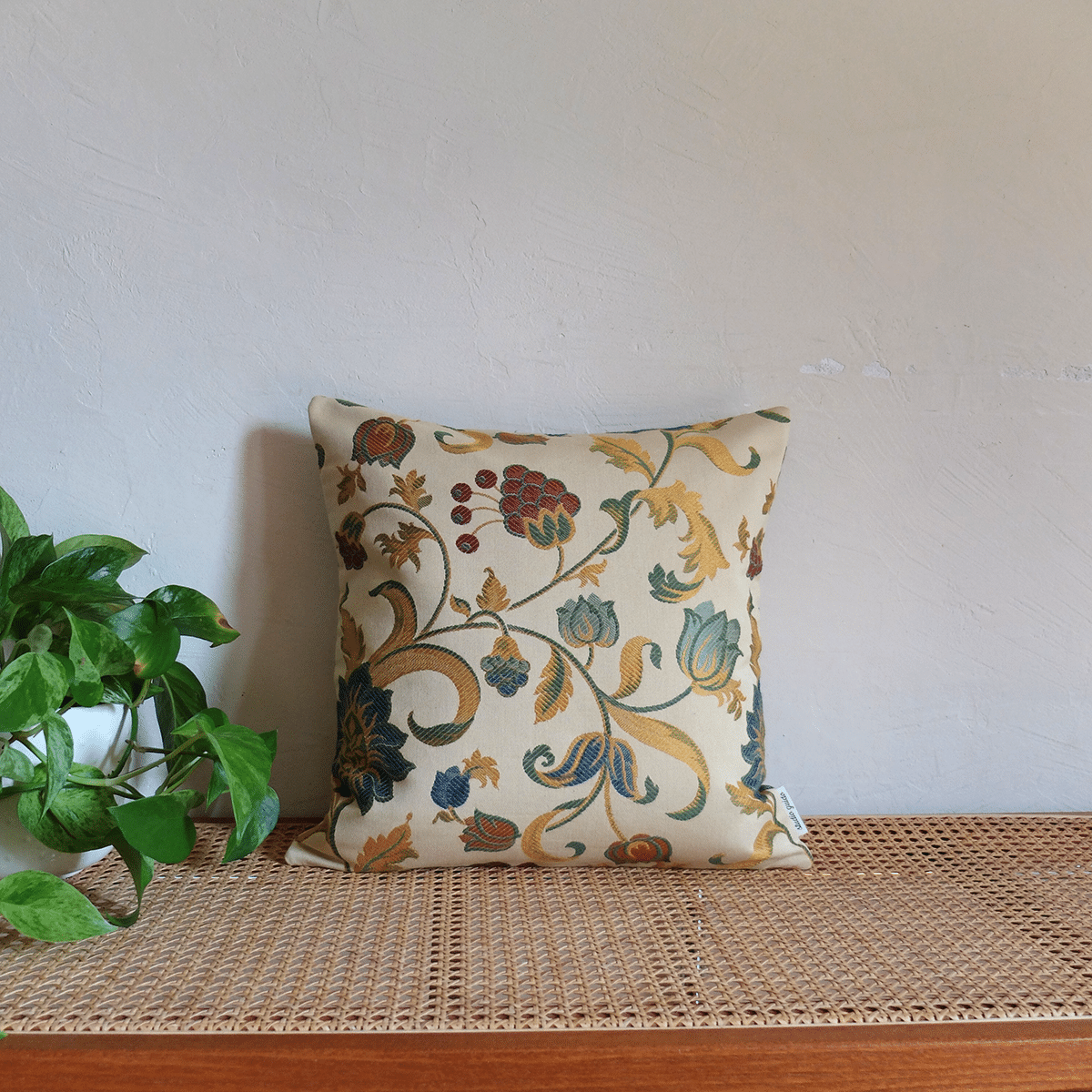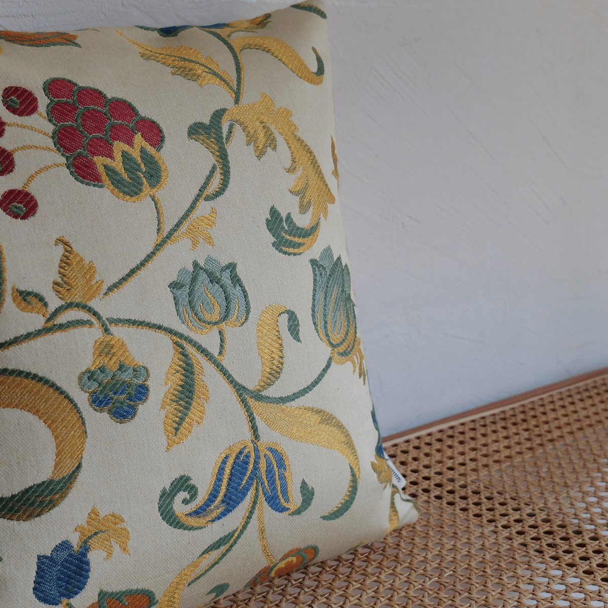 Funda de cojín confeccionadaa partir de un antiguo tejido de tapicería de estilo tapiz, con ricos motivos barrocos tejidos sobre un fondo beige / amarillo claro.