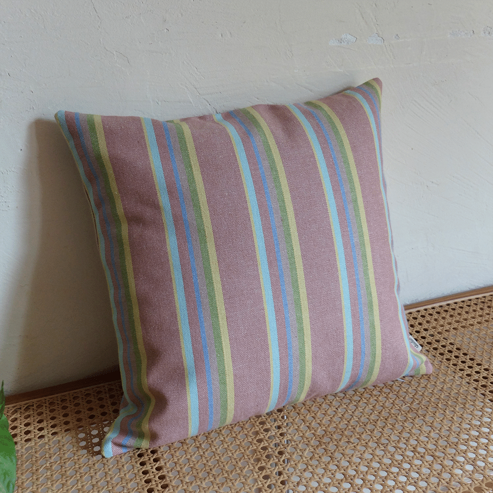 Funda de cojín de 40x40cm, confeccionada a partir de una antigua tela de tapicería de rayas claras (amarillas, verdes y azules) sobre fondo rosa.