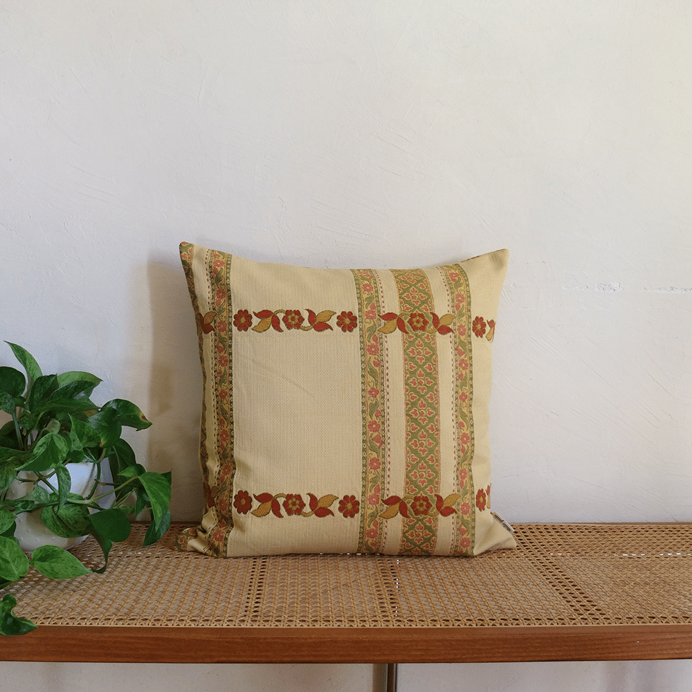 Funda de cojín de 50x50cm, confeccionada a partir de una antigua tela de tapicería, con fondo amarillo suave y estampado floral organizado en cenefas decorativas, tonos cálidos y naturales. La tela ha sido elegida cuidadosamente en Andalucía.