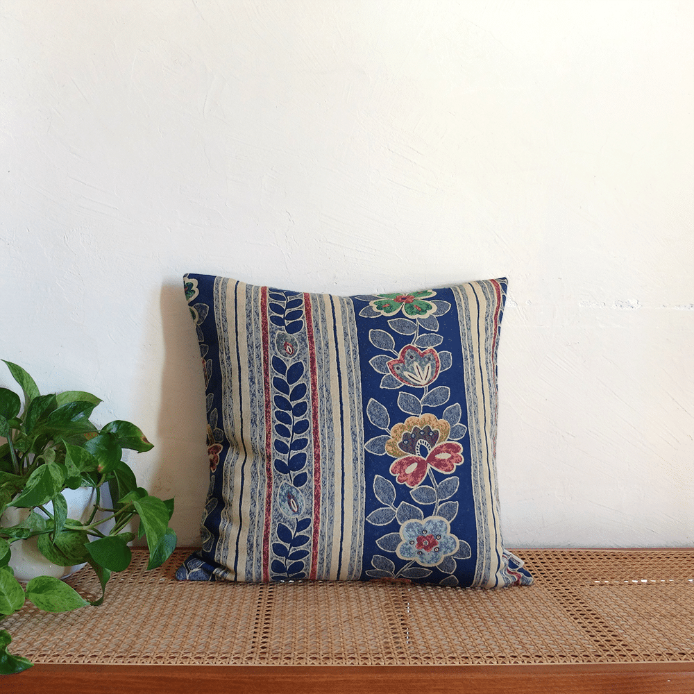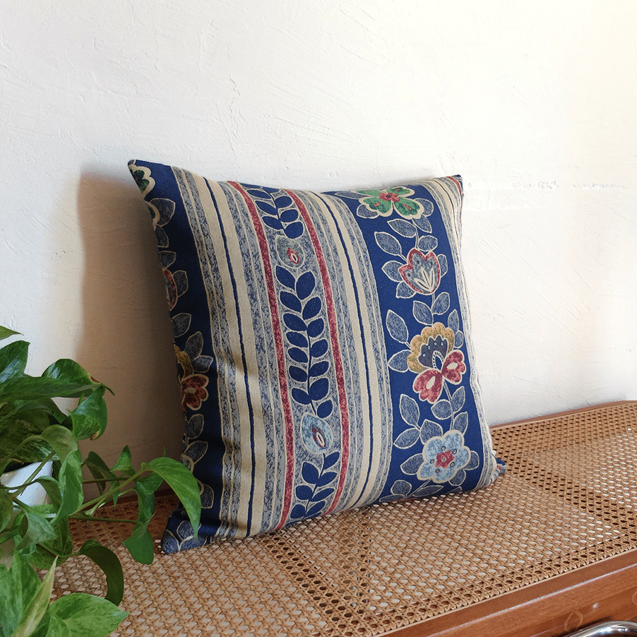 Funda de cojín de 50x50cm, confeccionada a partir de una antigua tela de tapicería, con estampado floral estilizado y rayas decorativas en tono azul índigo con algún toque de ocre y rojo ladrillo. La tela ha sido elegida cuidadosamente en Andalucía.